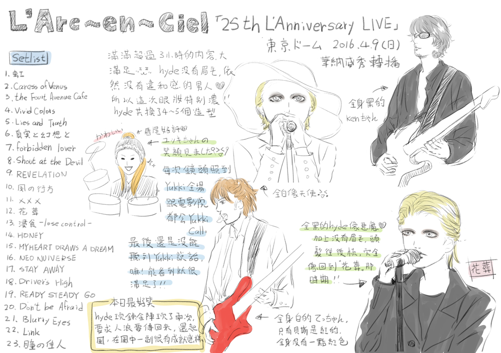 嘛,能看到就很滿足了!!中間唱Link時,hyde說要團員介紹,以為終於可以聽到yuki說話了,結果還是沒有。